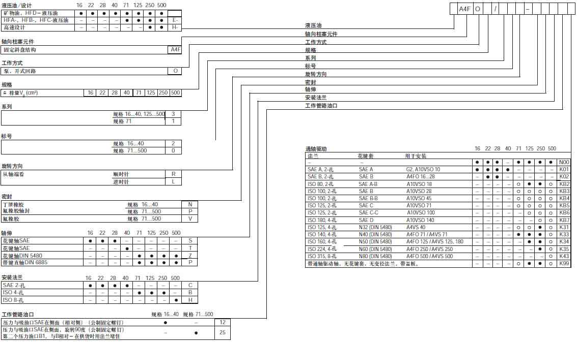 為了研究A4FO定量泵在采用所選液壓油時的運行情況,從數據表RC90220(礦物油)、RC90221(環保型液壓油)及RC90223(阻燃液壓油)中可以查到與液壓油的兼容性及應用數據相關的詳細說明。在采用HF-或環保型液壓油時,必須考慮到可能與技術canshu相關的限定。如果有必要,請向我們的技術部門查詢。規格為16…40的A4FO定量泵不適用于HFA、HFB或HFC-型液壓油。